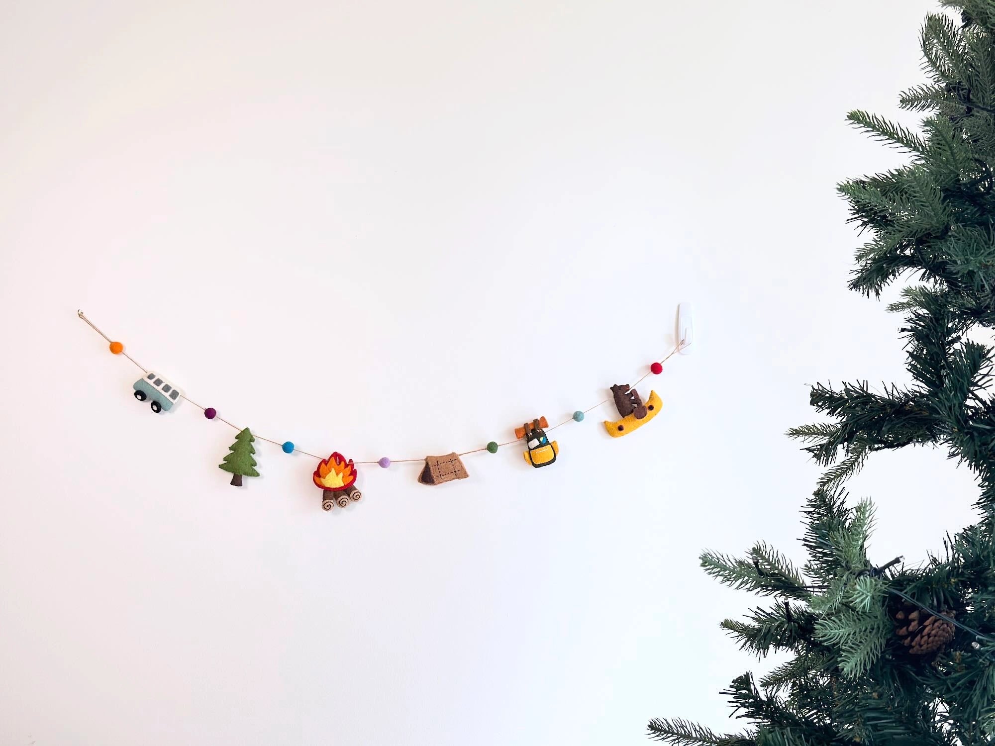 Embrace the spirit of adventure with this "Camping Garland." 🏕️ Featuring a charming blue mini van, a sturdy tree, a cozy campfire, a classic tent, a trusty backpack, a bear-adorned kayak, and more. Let this garland ignite memories of outdoor escapades and the thrill of the wild, bringing the essence of camping right into your space. 🚐🌲🔥🐻